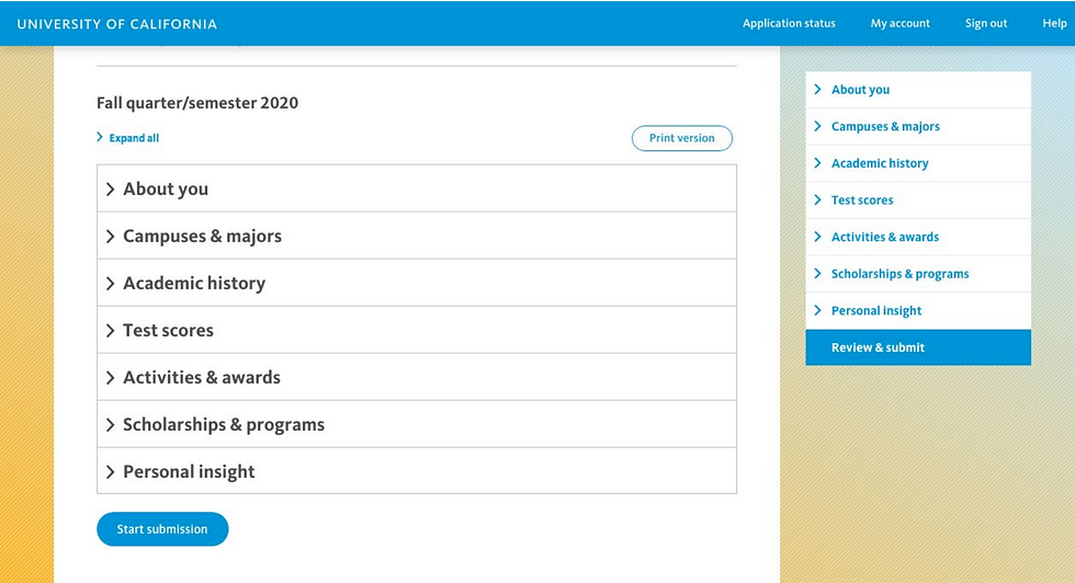 As of now, the UC system is test optional, so you may ignore the test scores section.
